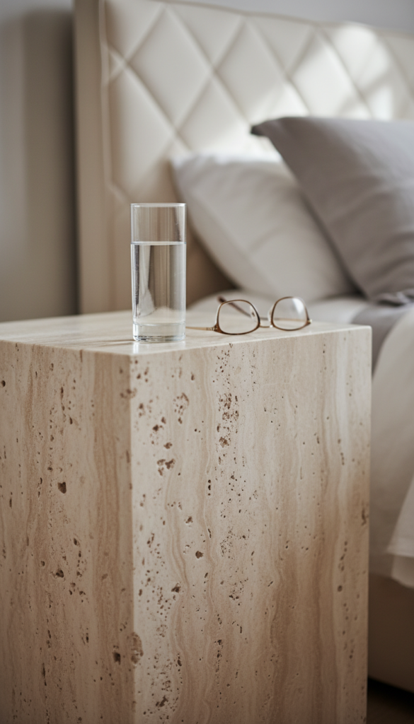 Bring the outdoors in with solid stone. Replace standard nightstands with travertine or marble side tables. The natural veining in the stone introduces an organic pattern that breaks up solid colors. Travertine, with its porous texture and warm creamy hues, specifically complements an earthy color palette perfectly.