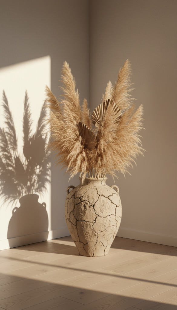 Fresh flowers are lovely, but large-scale dried botanicals make a sculptural statement. Place tall pampas grass or dried palm leaves in an oversized ceramic vase on the floor. Ideally, choose a vase with a rough, handmade pottery finish. This adds height to the room and reinforces the connection to nature.