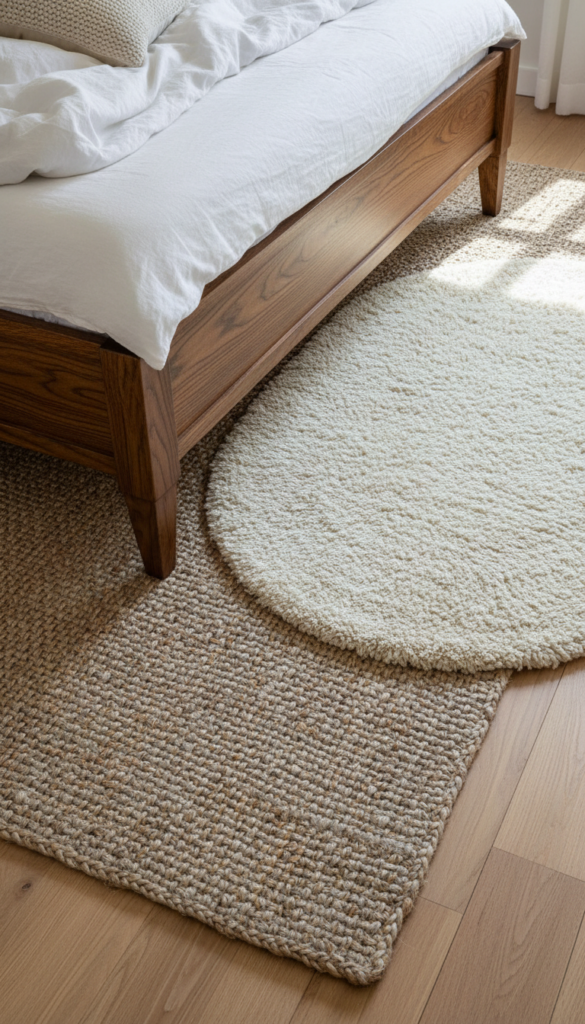 Ground the space with texture underfoot. Start with a large, natural jute rug to cover the majority of the floor space. Then, layer a smaller, plush wool rug on top, positioned partially under the bed. This combination offers the rustic durability of jute with the soft luxury of wool, adding visual interest and physical comfort.