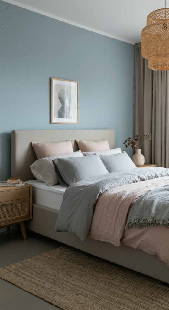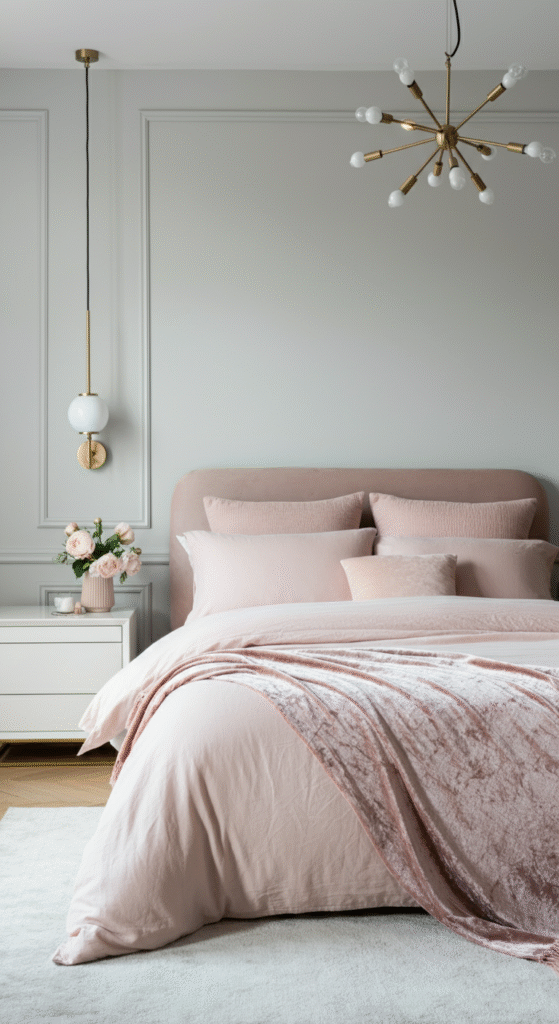 This pairing is perfect for creating a serene, welcoming atmosphere, making it an excellent choice for a bedroom. Light gray creates a sense of openness, while blush pink adds a subtle pop of color that’s neither overpowering nor too muted.