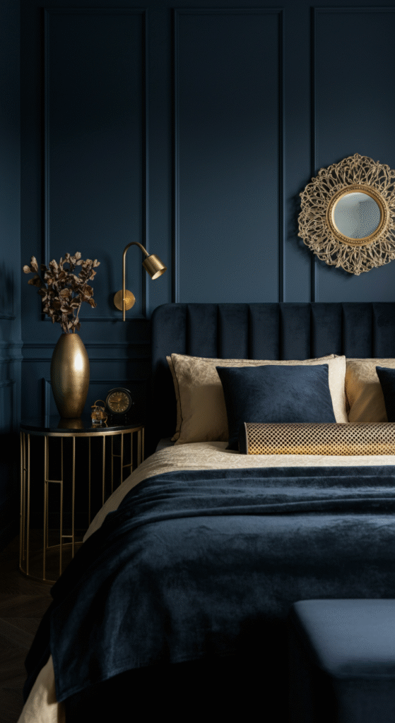 Interesting Fact: Navy blue is often associated with depth and stability, while gold symbolizes wealth and prestige. Together, these colors evoke a sense of power and elegance, making it a perfect choice for a modern bedroom.