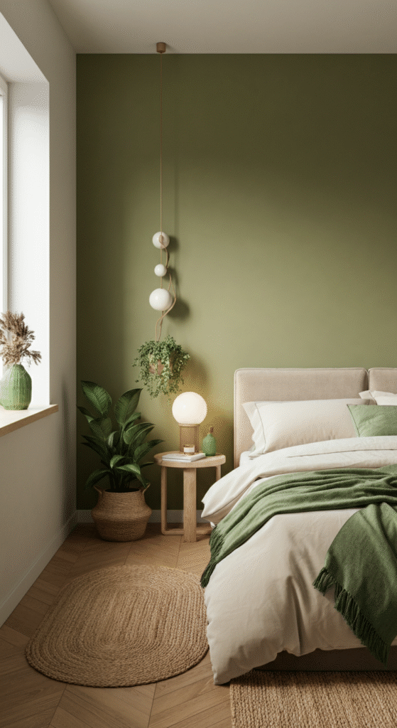This color combination works exceptionally well in modern bedrooms that aim to create a cozy, inviting atmosphere. Olive green is often associated with renewal and growth, while cream adds warmth and balance to the room. Together, they create a perfect retreat-like environment.