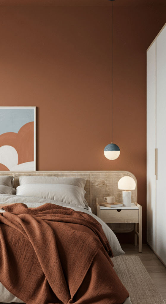 This combination works particularly well in modern, bohemian, or Mediterranean-inspired bedrooms. Terracotta, a color reminiscent of clay and earth, gives the room an organic vibe, while white ensures the space feels open and uncluttered.