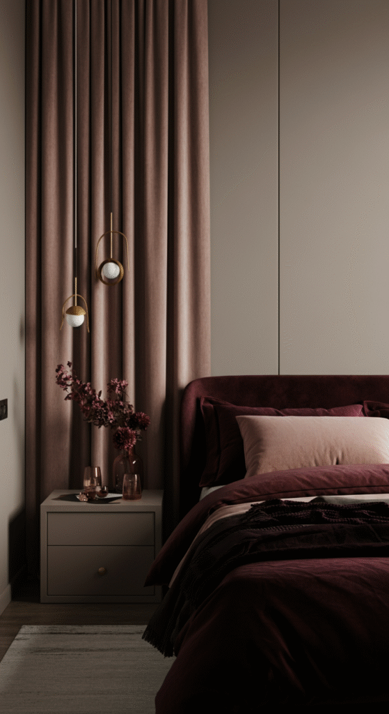 This combination evokes feelings of comfort and luxury, making it ideal for a modern, romantic bedroom. The contrast between the soft taupe and bold burgundy creates visual interest and adds sophistication to the room without feeling overpowering.