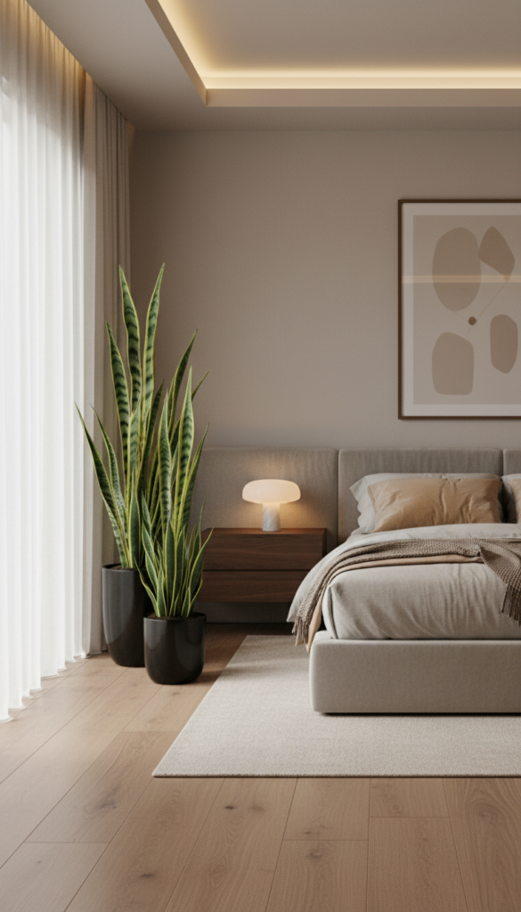 The Snake Plant and the ZZ Plant are the champions of low light. They can thrive in corners far from windows where other plants would fade, making them perfect for dimmer bedrooms.