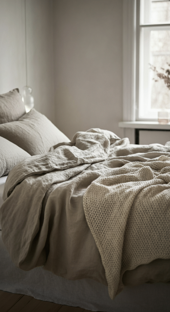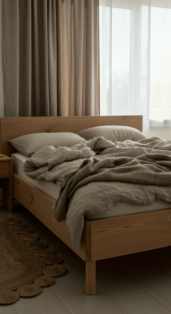 Scandinavian bedrooms avoid overly decorated beds. Instead they focus on comfort. A breathable comforter. Linen pillow covers. A light knit throw. The idea is gentle convenience.