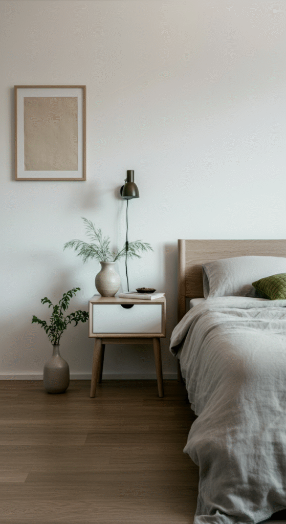 White is the heart of Scandinavian design, but it’s not only white. Soft beiges, muted greys, dusty creams, pale taupes. These tones bounce light across the room and make even a small bedroom feel open.