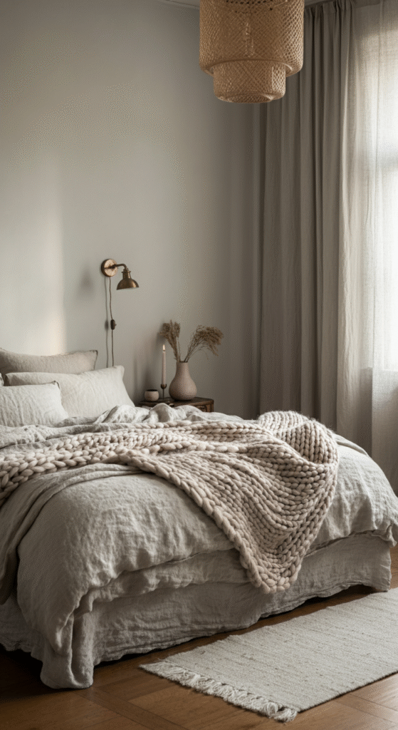 Think layered bedding, chunky knitted blankets, wool rugs, linen curtains.