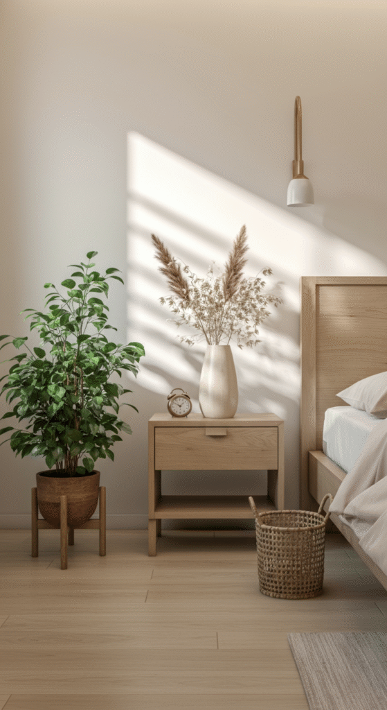 This could be a small plant, a branch in a vase, dried flowers, woven baskets, or wooden accessories. Anything that brings nature indoors lifts the mood of the bedroom.