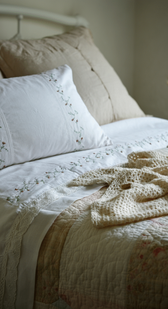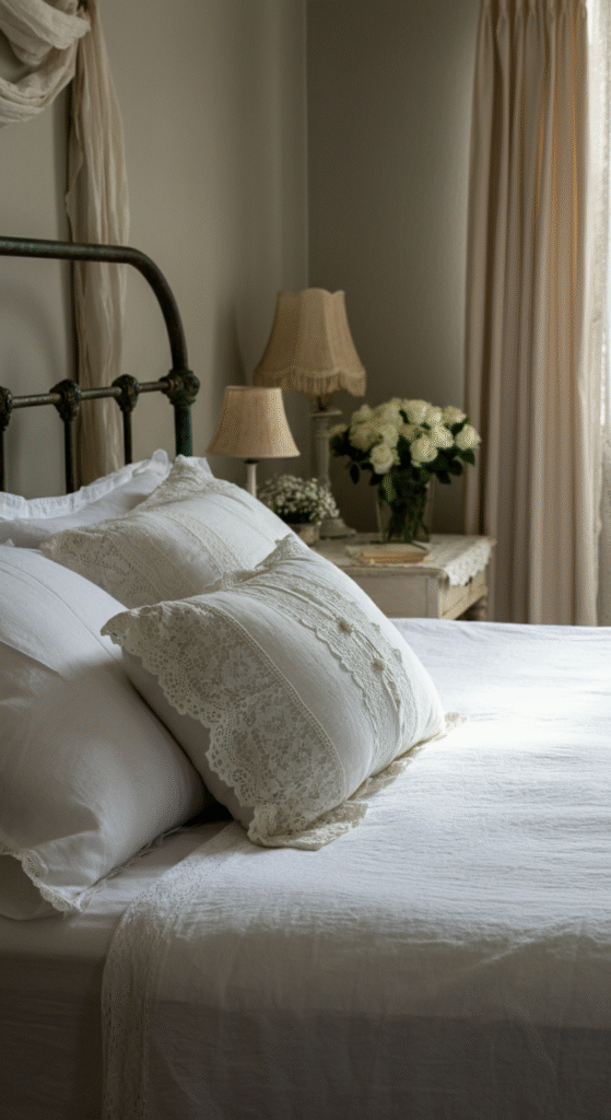 Layering textiles creates depth. Add one soft blanket, a printed throw, then a lace runner at the foot. The room will instantly shift from simple to soulful.