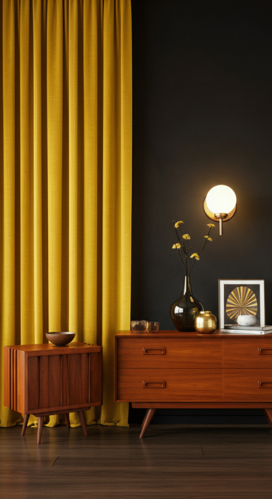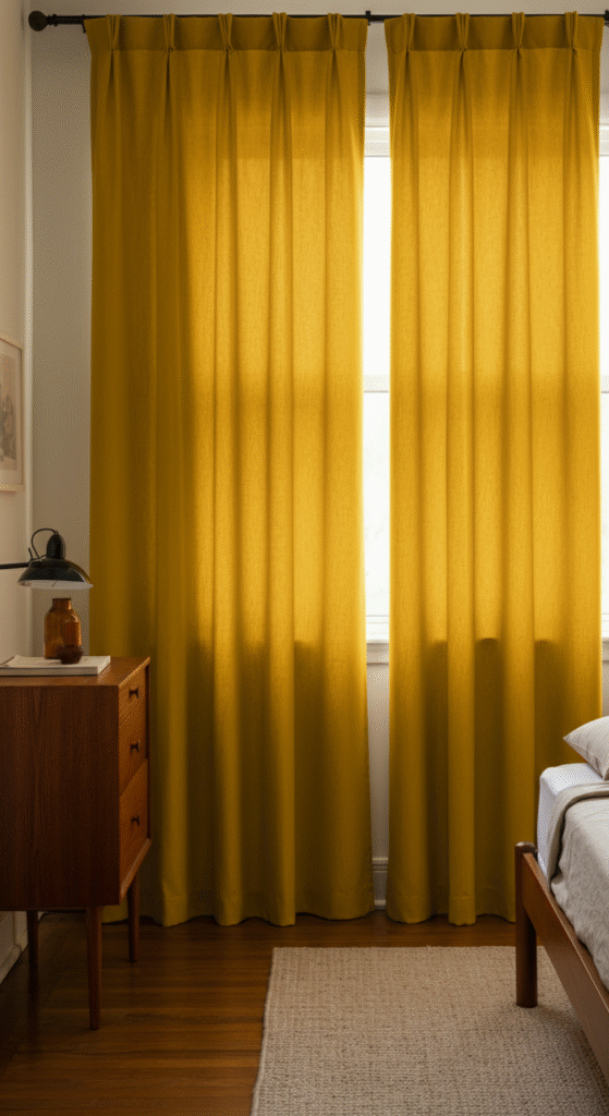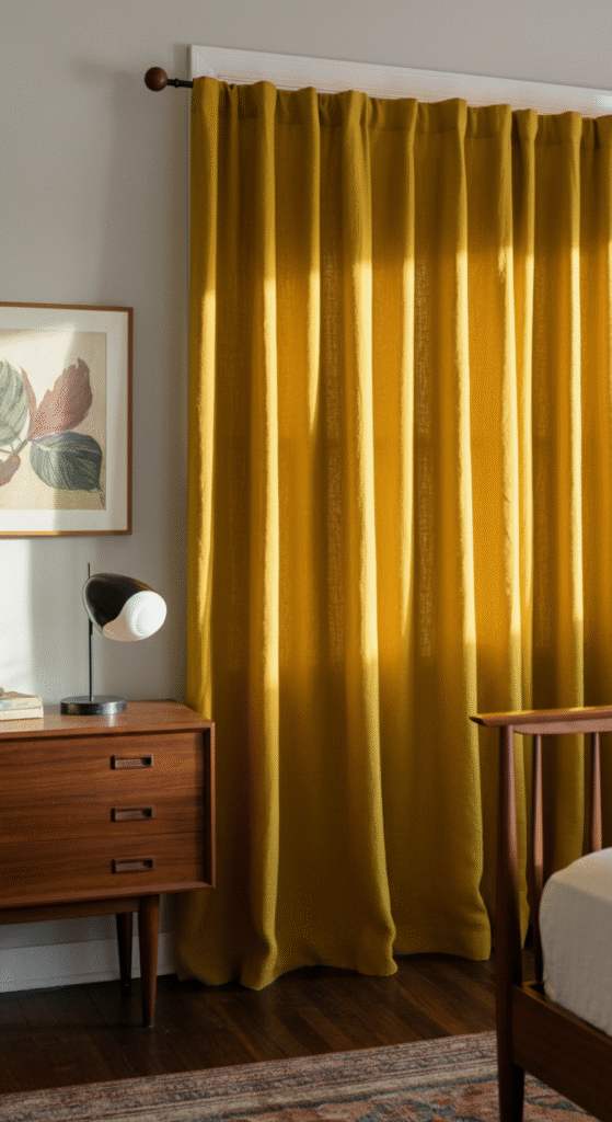 Golden yellow sits slightly brighter than mustard but still feels grounded when handled correctly. Curtains with a subtle vertical weave or texture add structure and rhythm, which aligns well with mid century design principles.