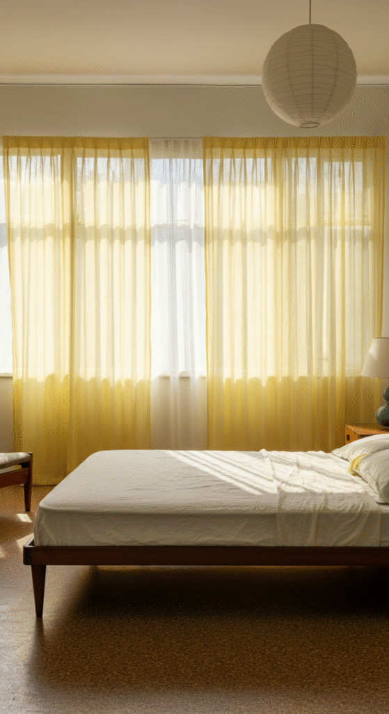 Sheer curtains in a pale yellow tone offer a gentle approach to color. They work best in bedrooms that receive ample natural light and already feature strong mid century elements like tapered legs, low profile beds, or geometric lighting.