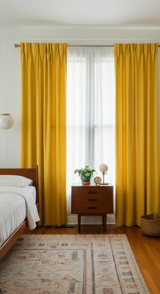 Below are nine bedroom yellow curtain styles that work beautifully with mid century decor. Each one explores a different shade, fabric, and mood while staying true to the design principles that define the era. Along the way, you will also find interesting design facts and subtle myths that often surround color use in vintage inspired spaces.