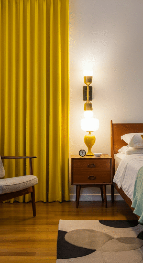An interesting fact is that many iconic mid century patterns were inspired by architecture and urban planning rather than nature. This is why geometric curtains feel so authentic in this style. Yellow softens the geometry, making it suitable for a restful bedroom environment.