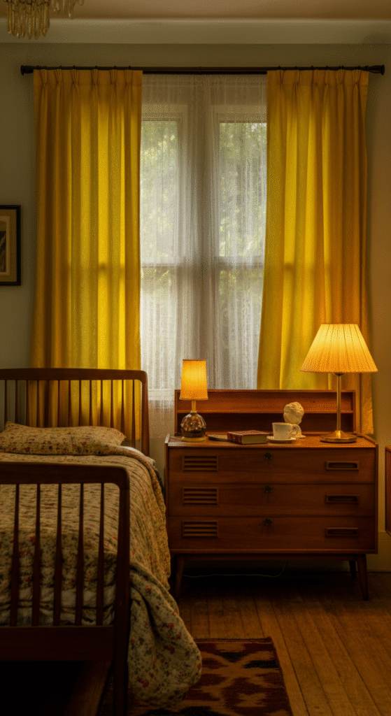 Curtains that feature a slightly faded or washed yellow tone evoke authenticity and nostalgia. This style works beautifully in bedrooms that aim to feel lived in rather than staged.