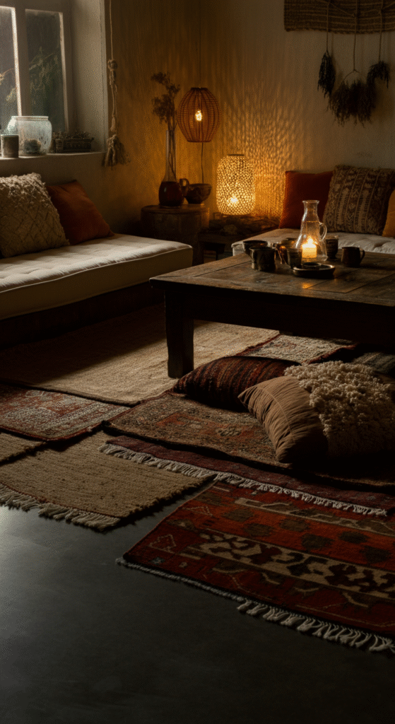 Incorporate elements like wood, natural stones, plants, woven rugs, and unique accessories. Mix patterns and textures for a cozy, inviting vibe.