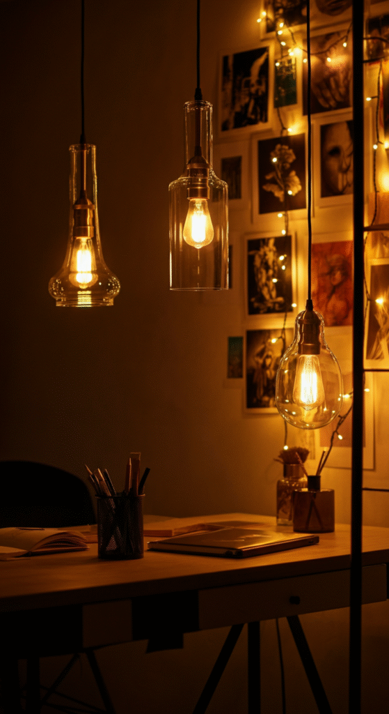 To achieve a boho vibe with lighting, think about low-hanging pendant lights in muted gold or brass, or colorful lanterns that evoke a sense of travel and cultural exploration.