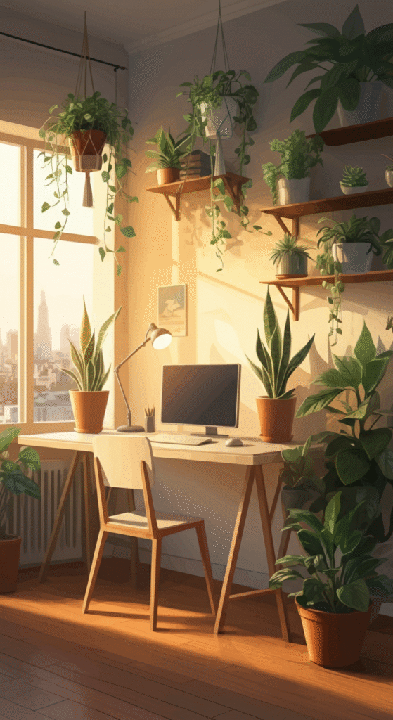 No boho space is complete without greenery. Indoor plants, particularly those with trailing vines like pothos or ivy, can help you create a refreshing and lively workspace. Choose plant pots that align with your desk’s aesthetic—rattan or terracotta pots will blend beautifully with your boho decor.