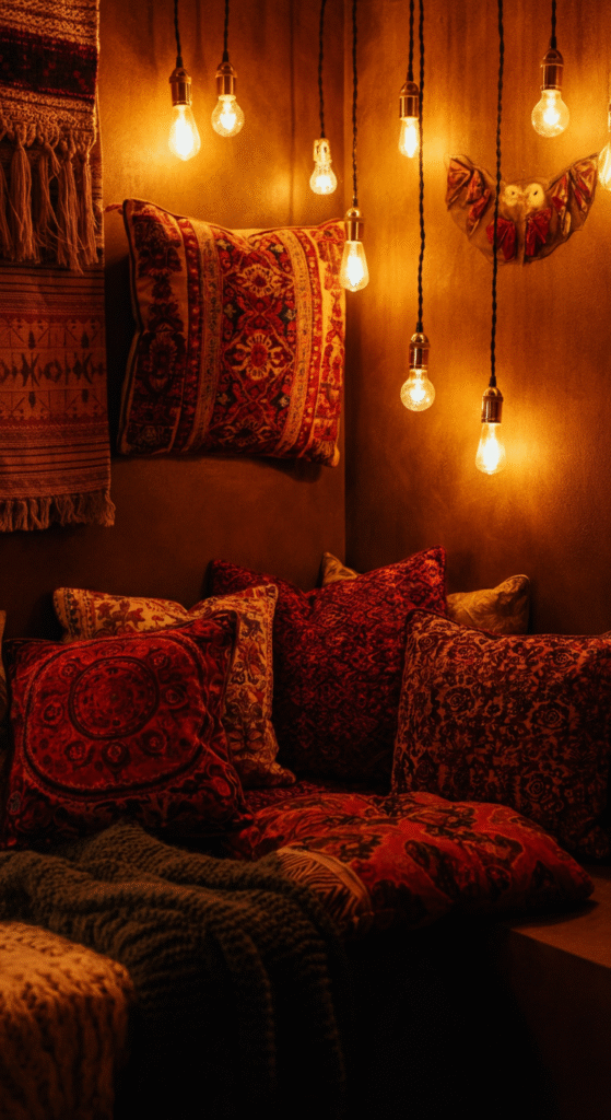 Lighting in a boho room is everything. Soft, ambient lighting creates a tranquil atmosphere and makes the room feel inviting. Pendant lights with intricate, woven designs are a staple in boho spaces, adding both elegance and an organic touch. Alternatively, fairy or string lights can be draped across the room to enhance the whimsical vibe.