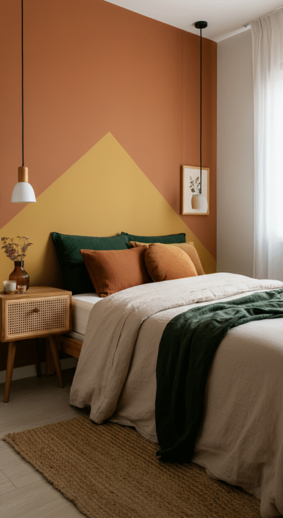 To make the most of these hues in a small room, consider painting your walls in a soft terracotta shade or using a mustard yellow accent wall. You can also layer your bedding with neutral tones like beige, white, or gray to create contrast and balance.