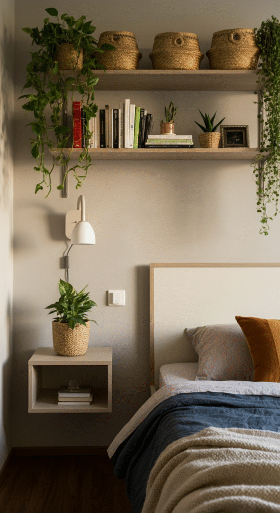 Opt for open shelving above your bed to display art, plants, or decorative books. Hanging plants in macrame planters can also bring in greenery without taking up floor space.