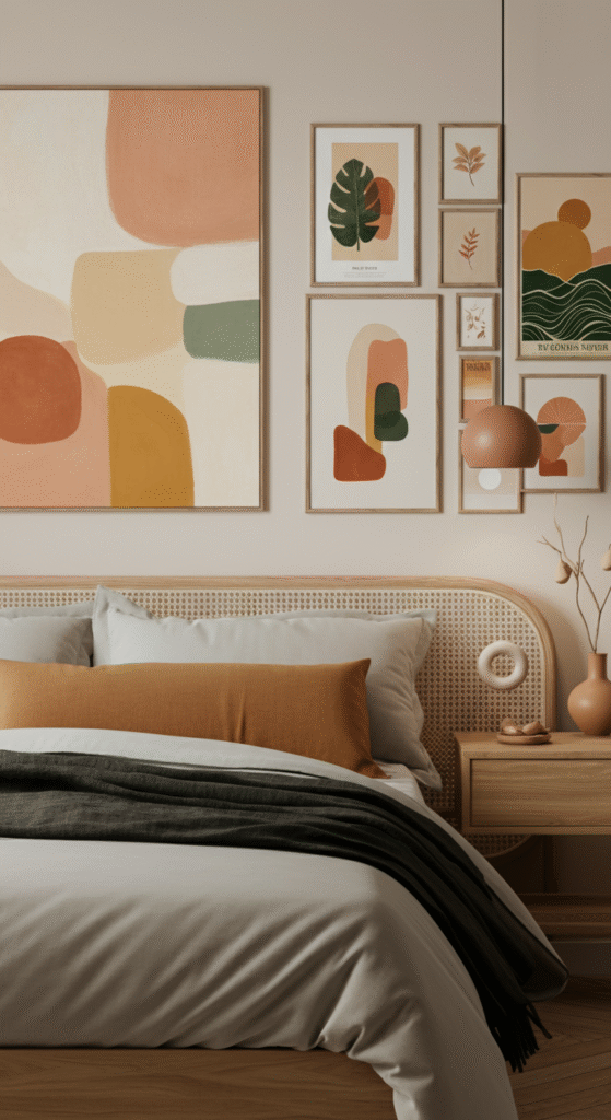 Art is a great way to personalize your space and give it a unique, Boho touch. For a small bedroom, focus on adding a few bold pieces of art that complement your overall color scheme. Think about abstract paintings, vintage posters, or handmade wall hangings.