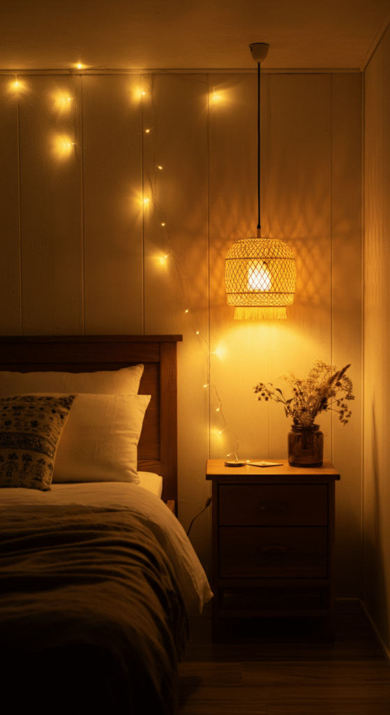Lighting is crucial for setting the mood in any room, and it’s especially important in a small Boho bedroom. Use a combination of ambient, task, and accent lighting to create a warm, inviting atmosphere. Think about adding string lights, lanterns, and table lamps to enhance the cozy vibe.