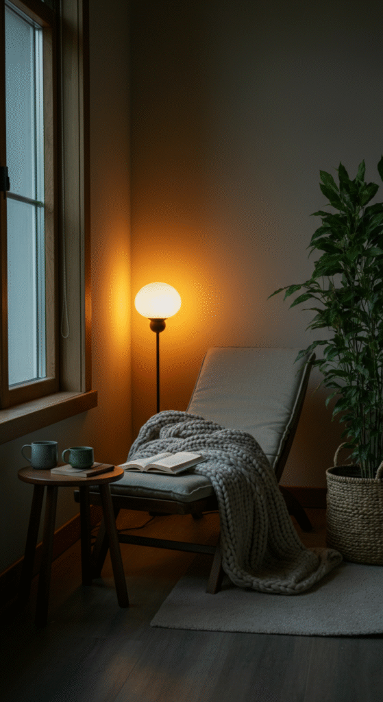 Pick a comfortable chair, add a soft throw, use warm lighting (like a lamp or string lights), and place a small side table with a plant or book for a peaceful corner.