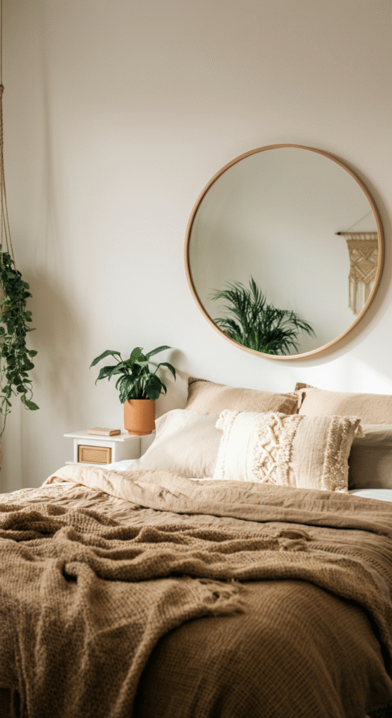 Hanging mirrors are an excellent way to incorporate mirrors into your boho bedroom without relying on traditional mirror placement. Hanging a mirror with a leather strap or metal chain from the ceiling can create a floating effect that feels both whimsical and light. This modern boho design works well in smaller spaces, where floor space is limited, as the mirror doesn’t take up any additional room while still serving as a statement piece.