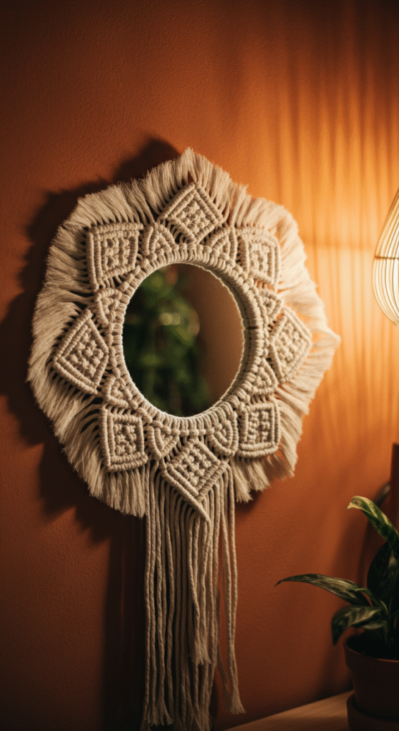 Macramé is one of the most iconic materials in bohemian decor, known for its knotting technique that adds a beautiful, tactile texture to the room. A macramé mirror frame is an excellent way to introduce intricate, handmade details to your bedroom while sticking to a natural color palette. The soft cotton knots paired with a round mirror can create a delicate, boho-inspired piece that brings both personality and charm to your space.