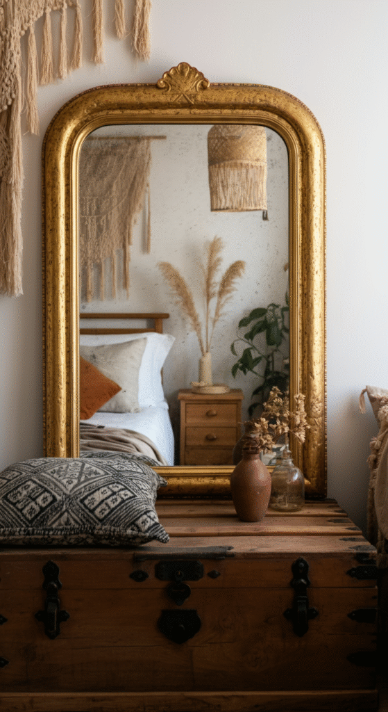 An antique mirror in your boho bedroom can be complemented with vintage-inspired furniture or eclectic artwork for a more curated, yet relaxed aesthetic.
