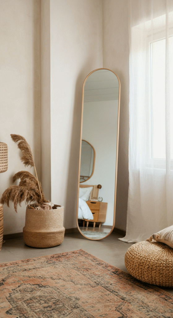 Place the mirror against a wall or in a corner to maximize space and light, while adding a bohemian touch with decorative baskets or poufs around it.