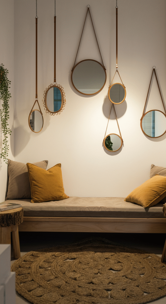 Consider pairing these hanging mirrors with low-sitting furniture like a rattan chair or a floor cushion to continue the relaxed, open feel in your space.
