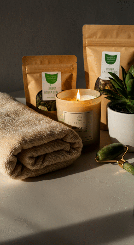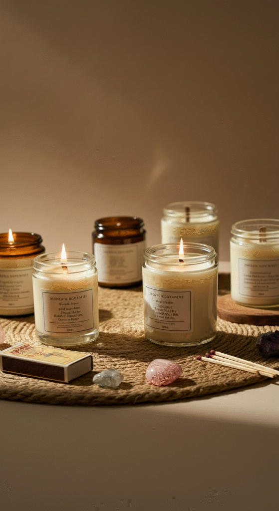 - A selection of hand-poured soy or beeswax candles in earthy scents like sandalwood, patchouli, and lavender