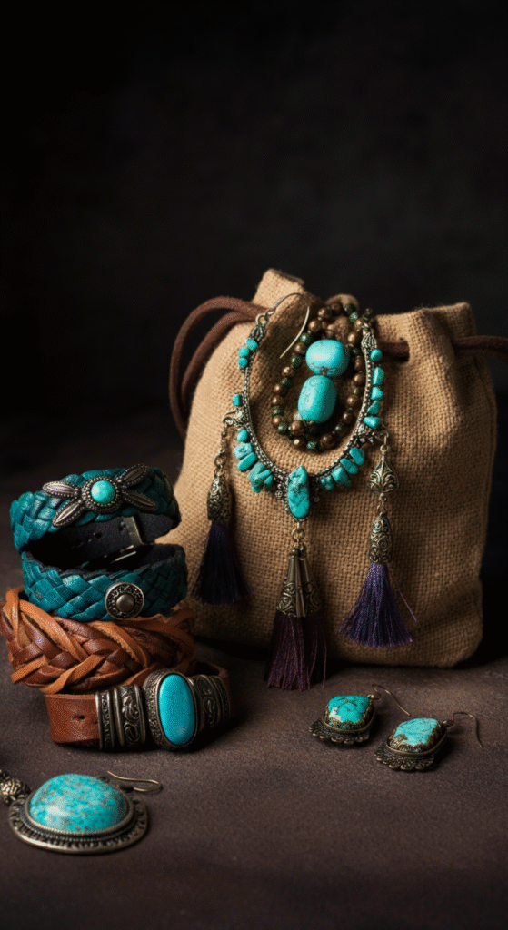 - Chunky necklaces with raw gemstones like turquoise or amethyst