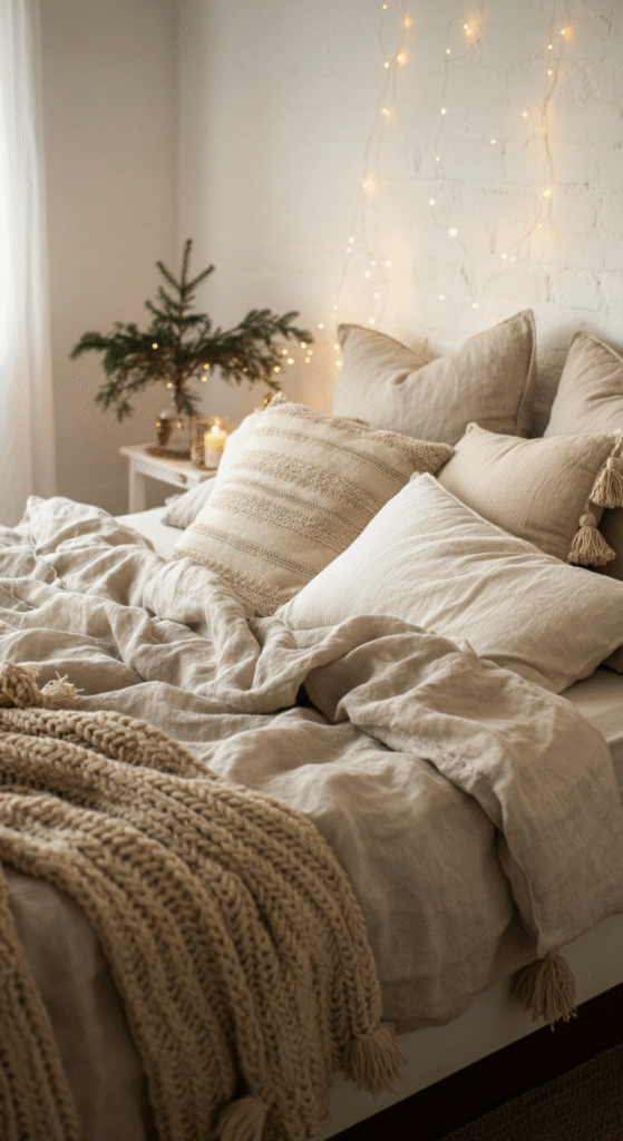 What if your Christmas bedroom could feel like a cozy retreat straight out of a bohemian dream — layered textures, twinkling fairy lights, and earthy tones all blending with the magic of the holidays?