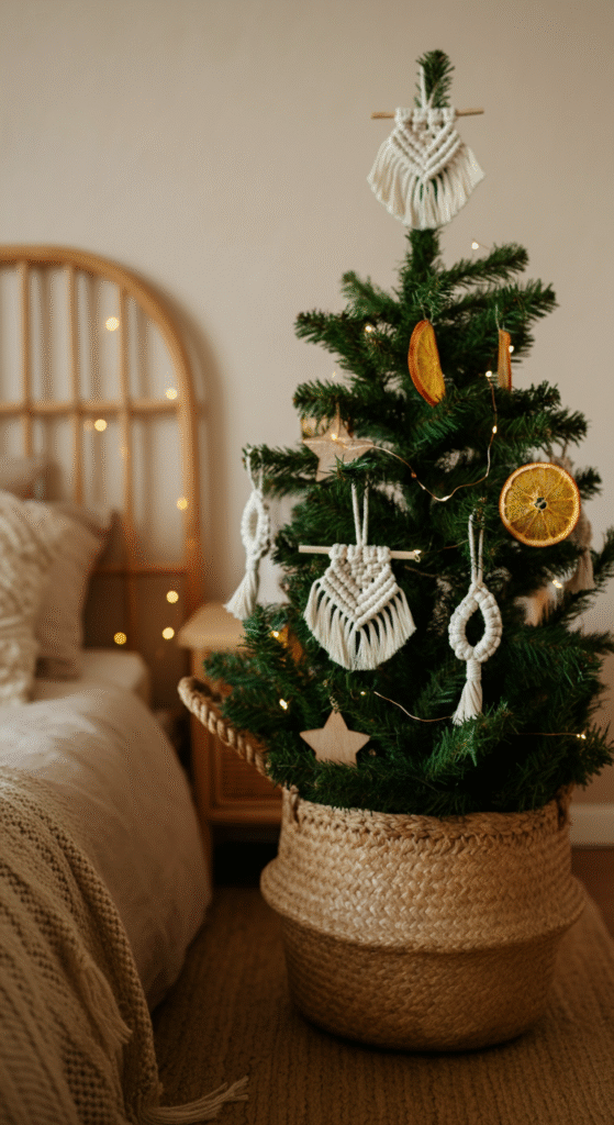A Boho Christmas tree isn’t about the glitter — it’s about character. Choose a small, rustic tree (real or faux) and decorate it with handmade or natural ornaments. Think dried oranges, pinecones, wooden stars, and macramé hangings.