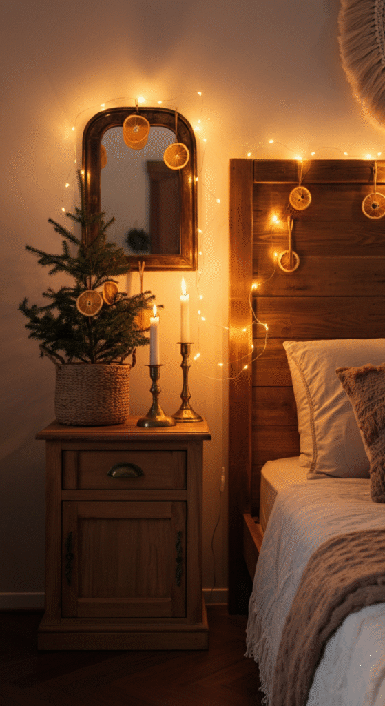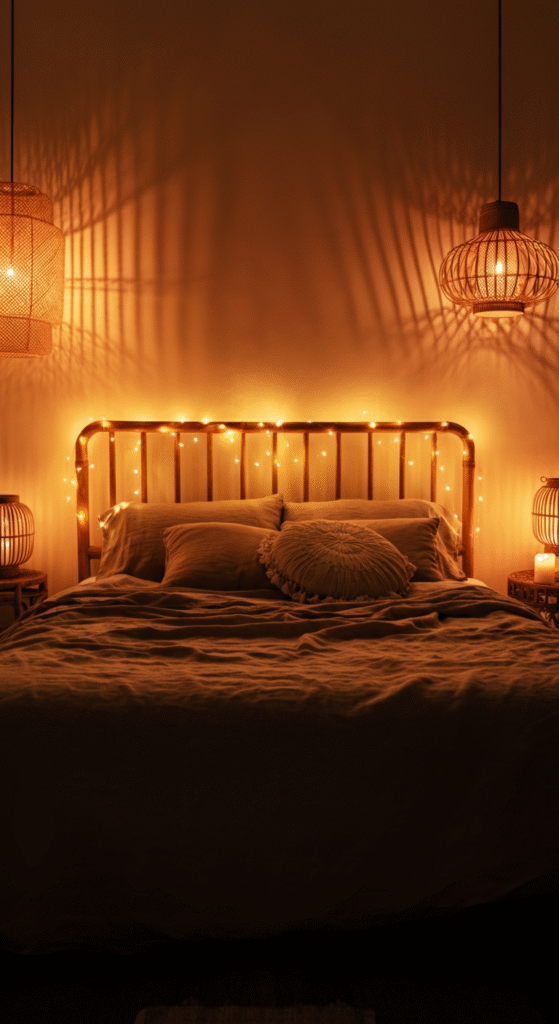 Lighting defines the entire mood of a Boho Christmas bedroom. Instead of relying on a single overhead light, play with layers of warm, diffused light.