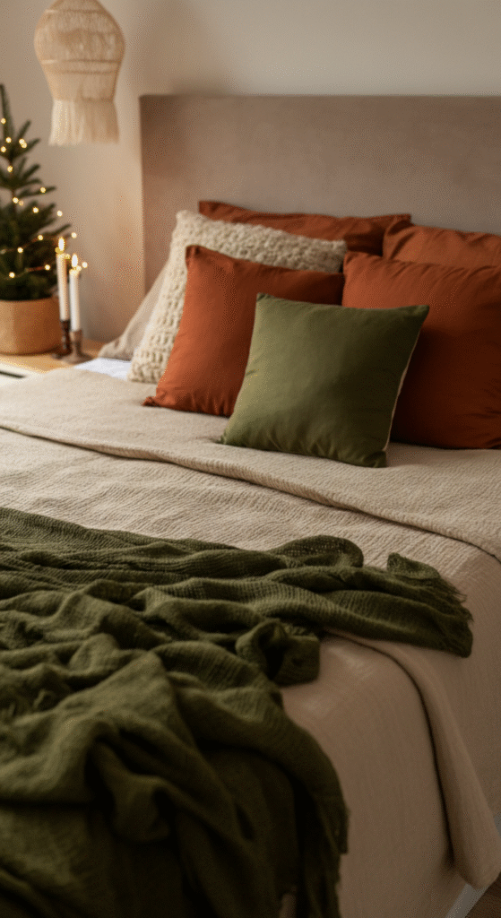 Forget the bold red and green combo — Boho Christmas is all about warm, earthy tones that blend naturally. Think terracotta, camel, ivory, olive, and muted gold.