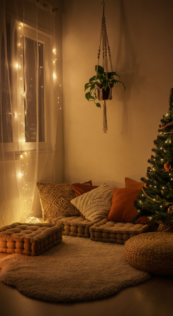 This corner becomes your quiet sanctuary amid the festive rush — your little Boho hideaway wrapped in calm and creativity.