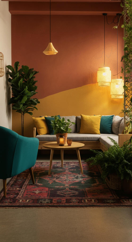 When selecting colors, think earthy tones like terracotta, mustard, and deep greens, which evoke a natural, grounded vibe. You can also add pops of bold colors like teal, burnt orange, or mustard yellow through accessories, textiles, or accent walls. The key is to balance bold hues with softer, neutral tones to maintain a sense of calm and warmth.