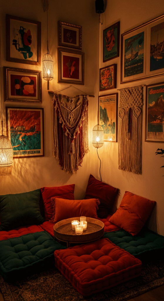 While boho style is often associated with earthy tones, it also embraces pops of bold, vibrant colors. Consider incorporating rich hues like mustard yellow, burnt orange, deep teal, or emerald green into your nook. Whether it’s through accent pillows, a colorful rug, or a statement wall, these colors can add energy and personality to your space.