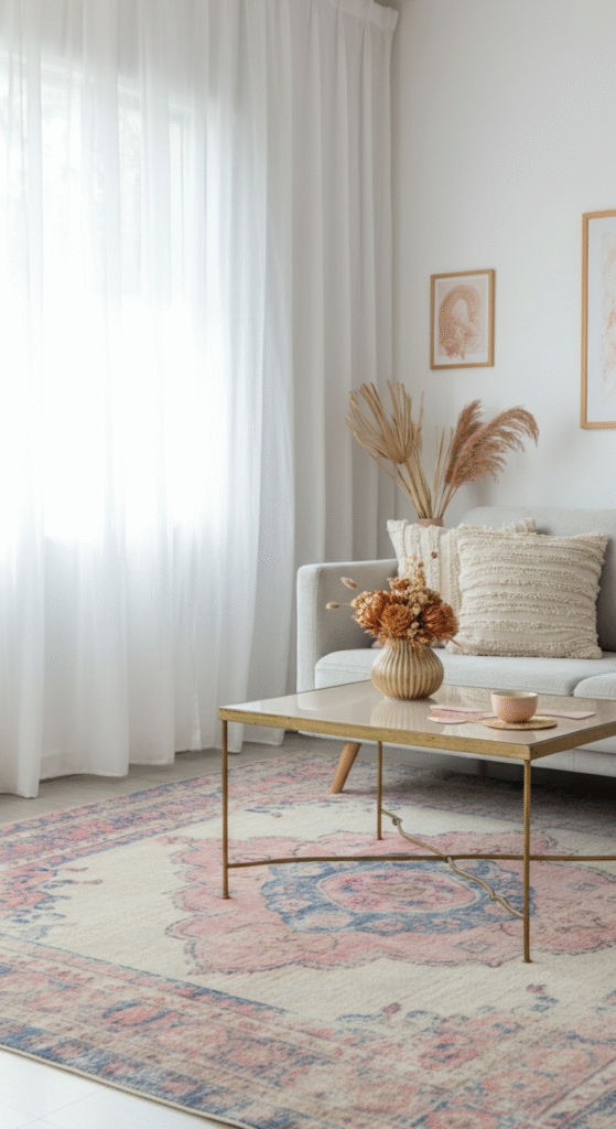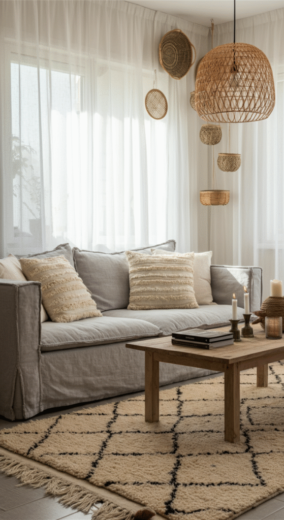 Boho doesn’t always mean bold colors. Sometimes, it’s all about texture. A shaggy or tufted rug in cream, beige, or faded blush adds cozy warmth under a grey couch without overpowering the room.