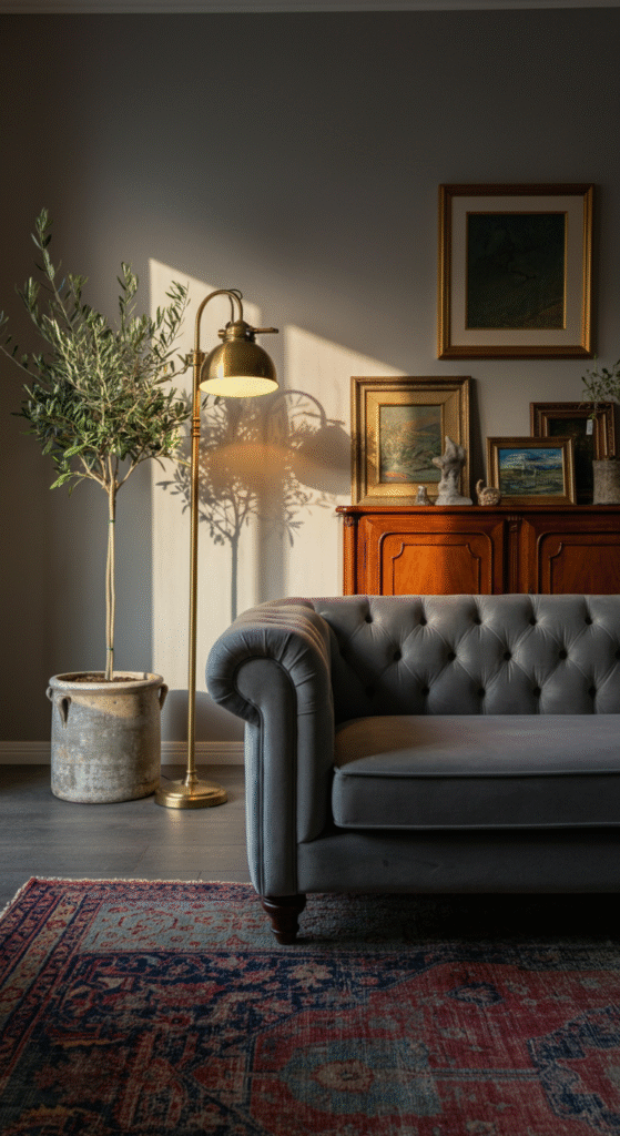 If your grey couch has clean lines and modern upholstery, an aged Persian rug can instantly warm up the vibe. The faded dyes, floral medallions, and worn edges give that “lived-in” charm that makes a home feel real.