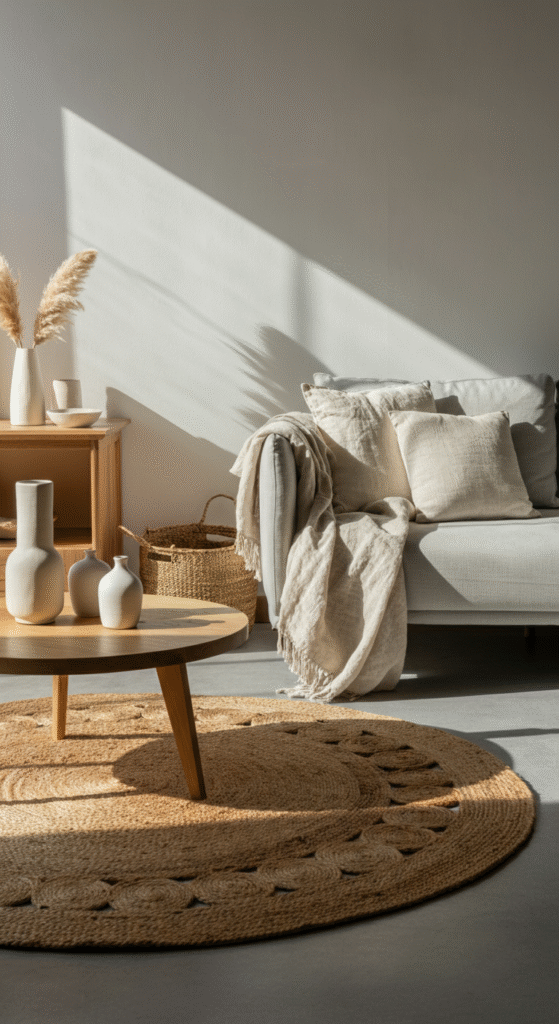 Layer it with smaller patterned rugs on top if you want to amplify the boho aesthetic — think black-and-white mudcloth or colorful Turkish kilims. The jute base gives stability, while the upper rug adds depth and texture.