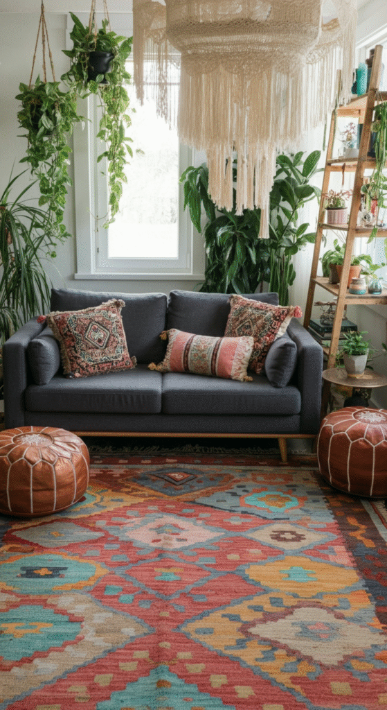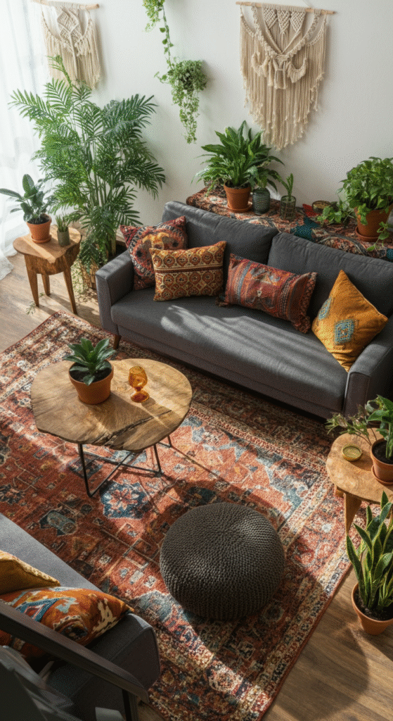 The bohemian style is all about freedom — mixing textures, patterns, and colors that shouldn’t work together but somehow do. It’s expressive yet grounded, eclectic yet calming. And when you add a boho living room rug under a grey couch, you create that perfect balance between modern simplicity and artistic charm.