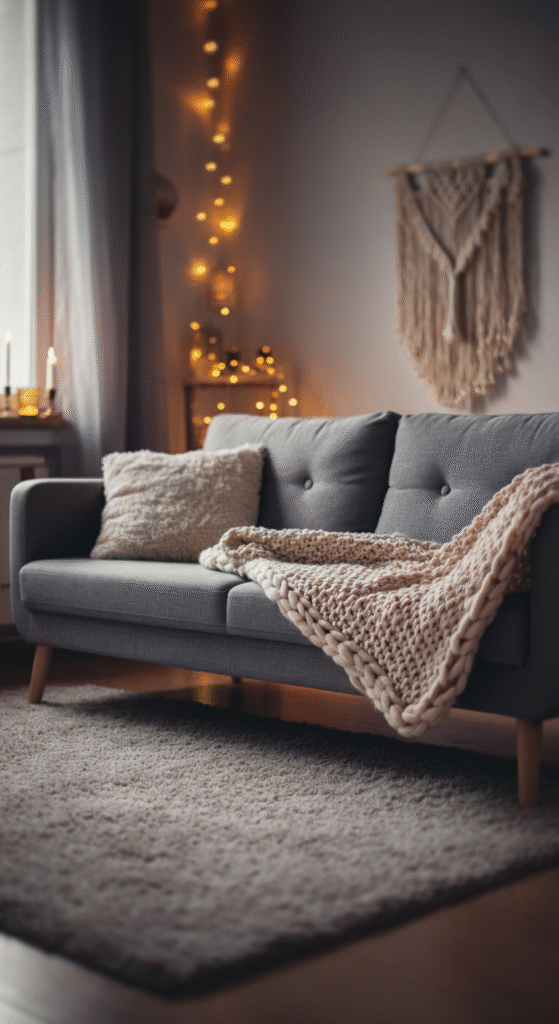 The combination of a smooth grey sofa with a fluffy rug creates irresistible tactile contrast. Add a few woven throw blankets and textured pillows, and you’ve got a living room that feels like a soft retreat.