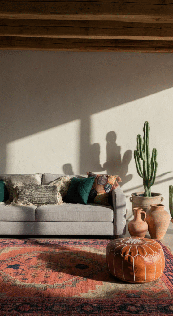 Pairing a boho living room rug with a grey couch isn’t just a decor choice — it’s a statement of personality. The grey acts as your blank canvas, while the rug adds soul, history, and warmth. From Moroccan patterns to jute blends, each style tells a different story — modern, rustic, vintage, or artistic.