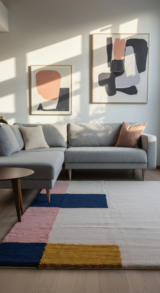 A soft grey couch acts as a neutral anchor, letting the rug’s artistic flair shine. Combine with mid-century modern furniture or minimalist decor to create that perfectly imperfect modern-boho blend.
