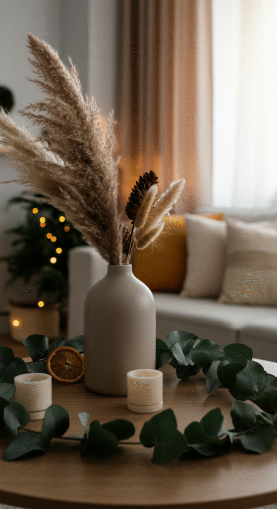 Forget the plastic garlands. The Boho holiday aesthetic leans into nature — eucalyptus sprigs, dried pampas grass, pinecones, and even olive branches.